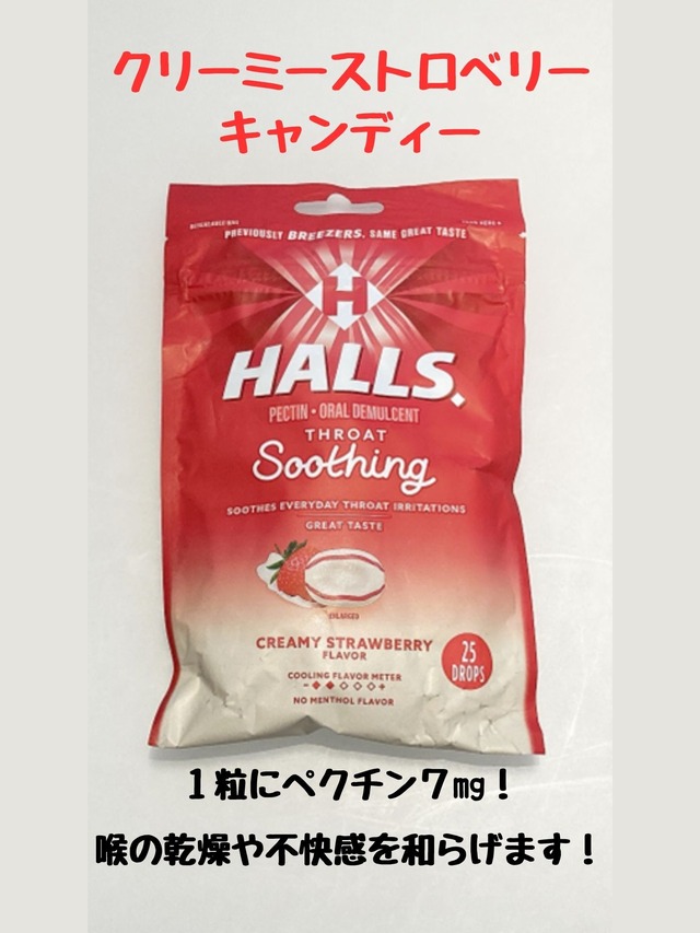 HALLS Throat Soothing クリーミーストロベリー 喉の乾燥を和らげるドロップ 1粒あたり7mgのペクチンを配合した爽やかなクリーミーストロベリー風味のドロップは、 メントールフリーで、毎日の喉の不快感を和らげ、咳を鎮め、喉の痛みを和らげ、鼻腔を冷やして、つらい症状をすばやく和らげます。 1粒を口の中でゆっくりと溶かし、必要に応じて繰り返し使用することで、口内炎や喉の痛みに伴う症状を一時的に緩和します。 個包装で、ジッパー付き袋に入っているので持ち運びやすく、鮮度も保ちます。 健康的なギフトやケアパッケージに最適です。1袋に70粒入っています。