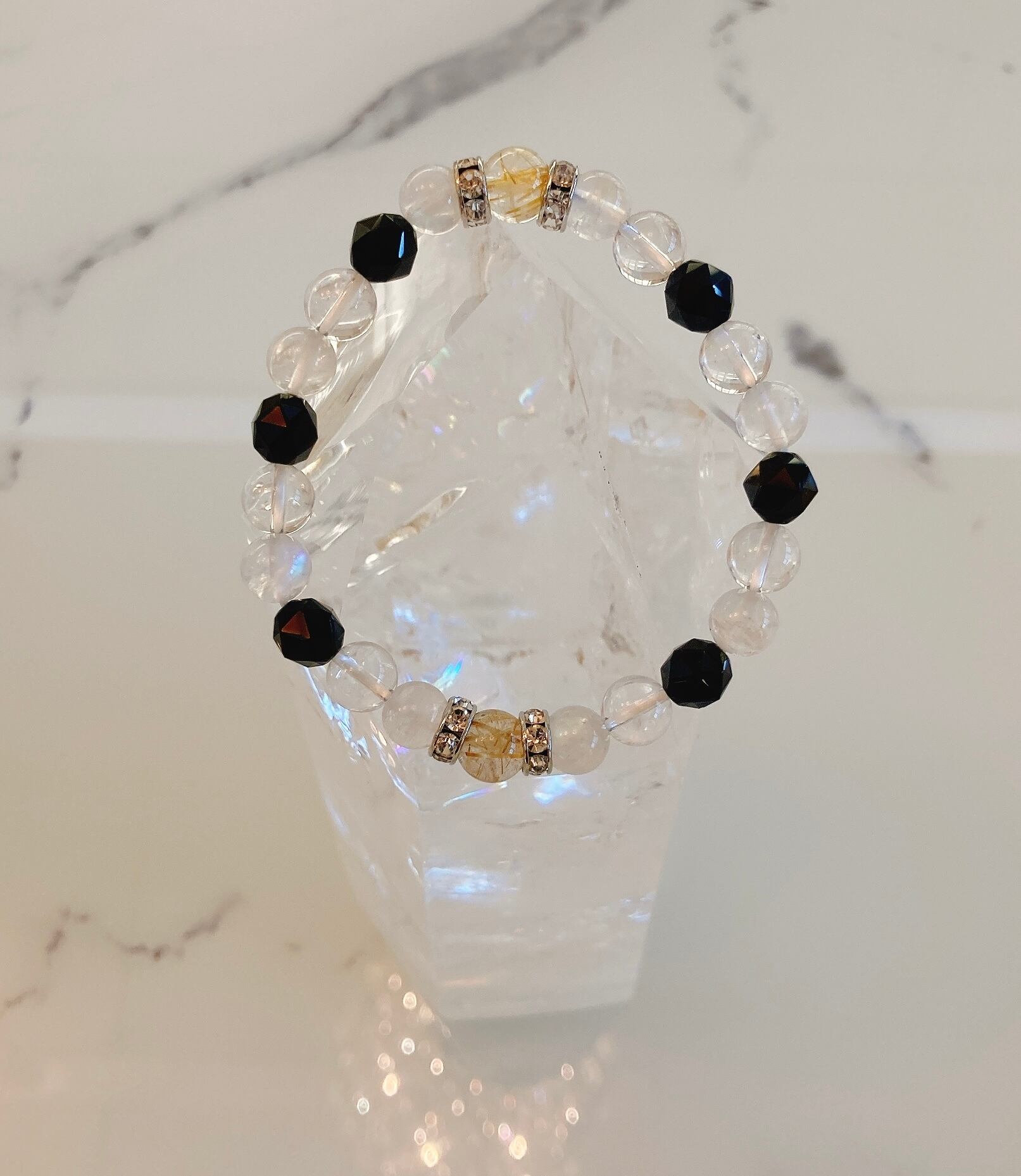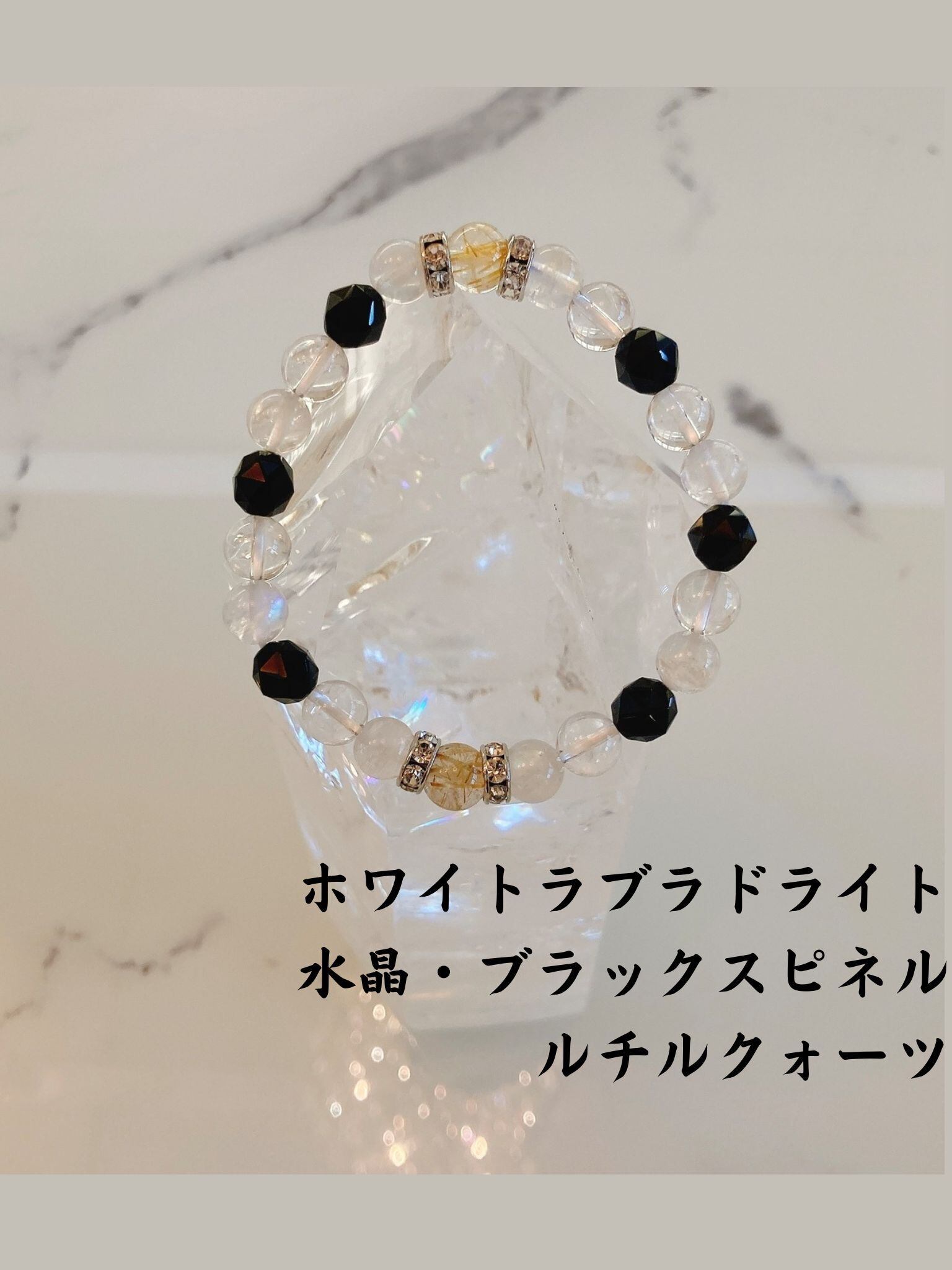 *新作* ホワイトラブラドライト・水晶・ブラックスピネル・ルチルクオーツ・ロンデルシルバー 17cm =潜在能力の開花・仕事運・厄除け= 45-2-1