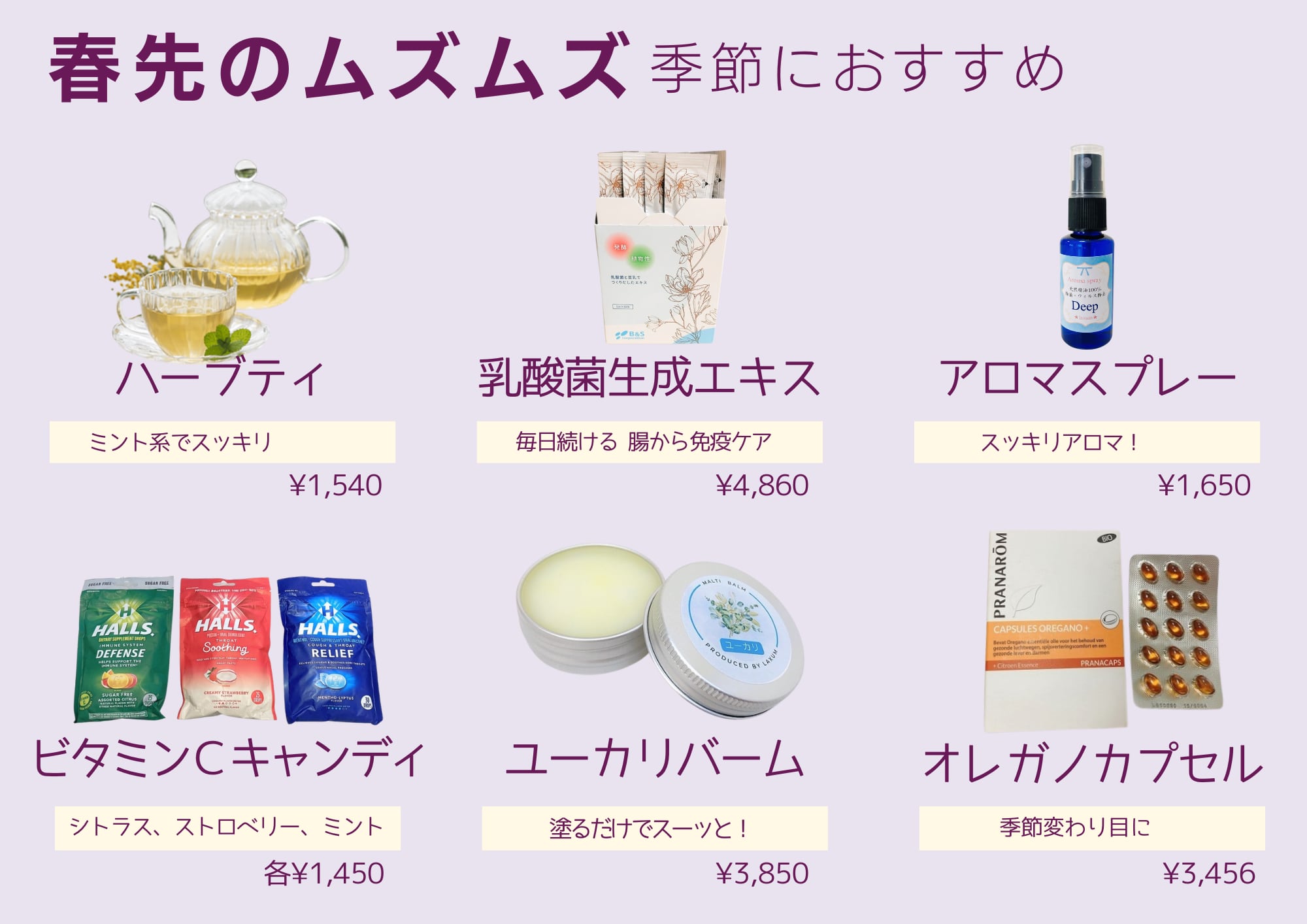 ペパーミント:ペパーミントに含まれているミントポリフェノールには植物由来の抗酸化作用を持つ成分で細胞の老化を防ぐ働き、またヒスタミンの生成を阻害する働きがあり花粉症を抑えるのに効果的です。