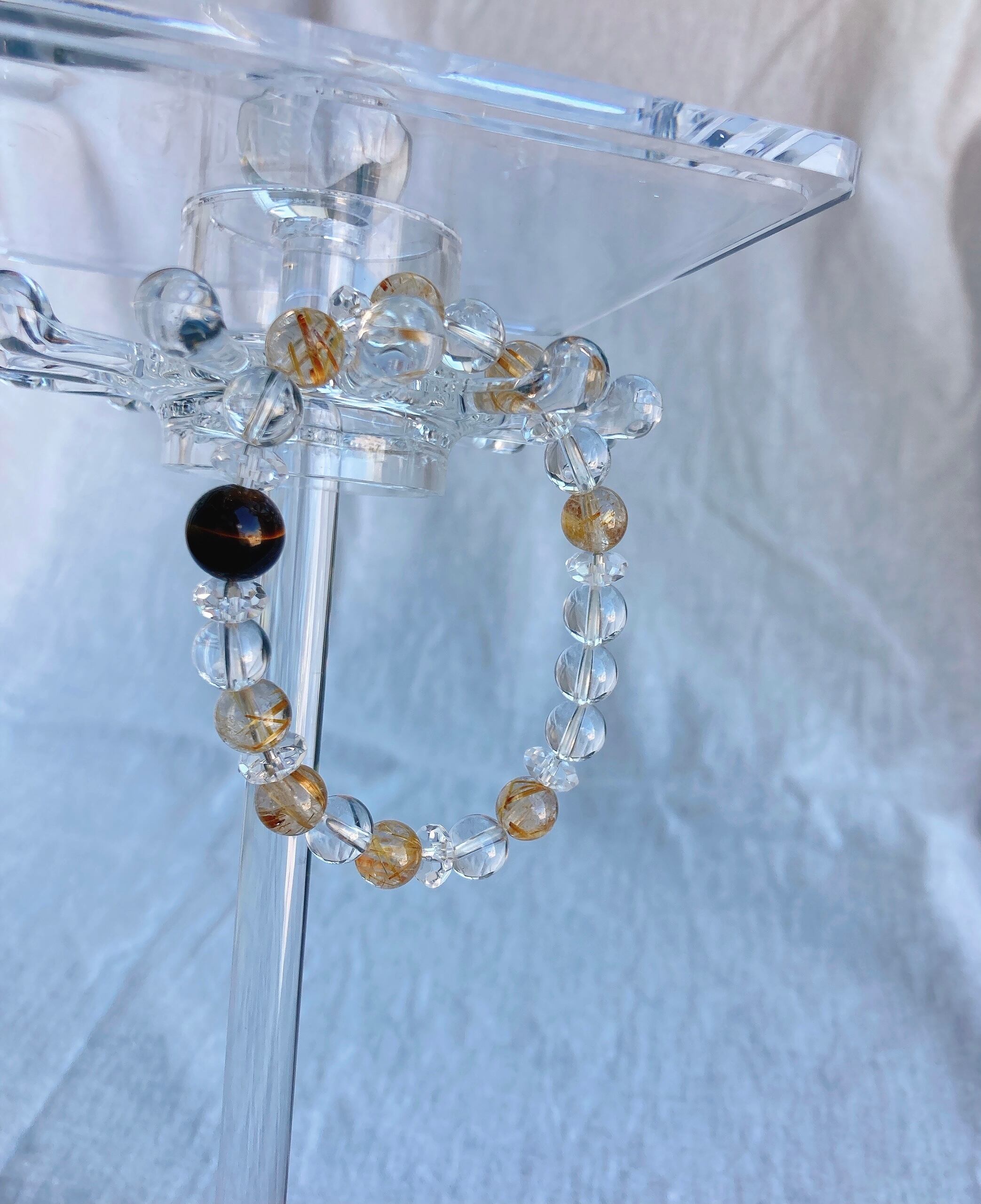 金運に恵まれるゴールデンルチルクォーツを中心に、タイガーアイとロッククリスタルを配した組み合わせです。