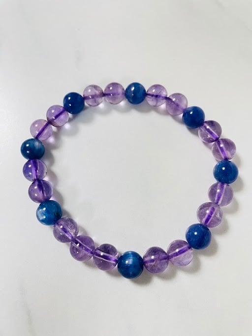 カイヤナイトとラベンダーアメジストを贅沢に組み合わせた、高品質の天然石ブレスレットが登場しました。カイヤナイトは、神秘的な色合いが美しく、マインド・ボディ・スピリットの調和をもたらすとされている石です。ラベンダーアメジストは、高級なアメジストの中でも上質な品質を示す、色合いが美しい石です。この2つの石を組み合わせることで、より深いリラックス効果や、精神力の強化効果を発揮すると言われています。
