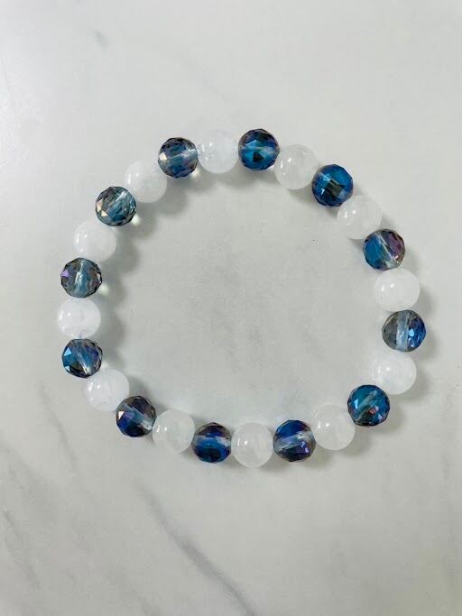 キラキラ輝くスノークォーツと美しいブルーグラデーションのアクアオーラを組み合わせた、幸運や愛を引き寄せるパワーストーンブレスレット。