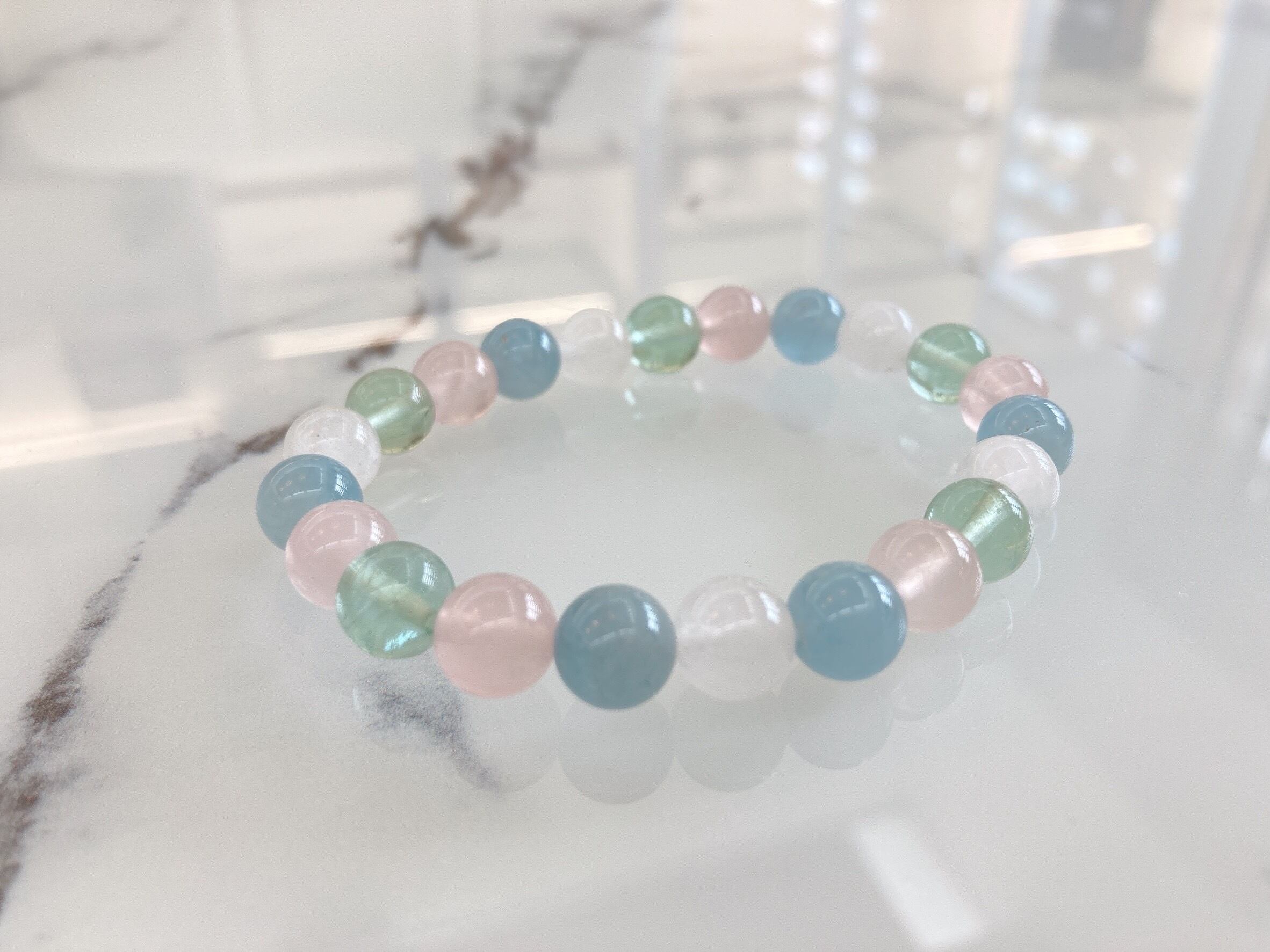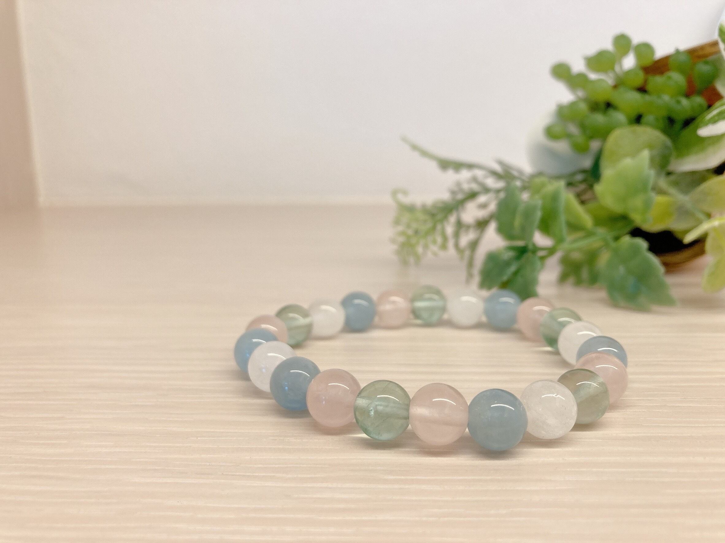 アクアマリン8mm3A+グリーンフローライト8mm3A+ローズクォーツ8mm3A+スノークォーツ8mm 16cm女性用